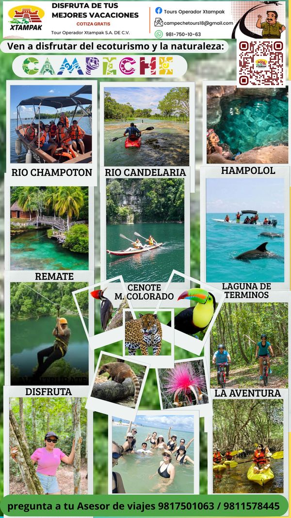 En CAMPECHE puedes visitar EL RIO DE CHAPTON , RIO DE CALENDARIA y HAMPOLOL como EL CENOTE COLORADO , LAGUNA DE TERMINOS con su hermosos colores y disfruta de las maravillosas especies que te puedes encontrar en el camino