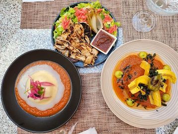 Cocina peninsular con opciones del mar, tierra y alternativas veganas.